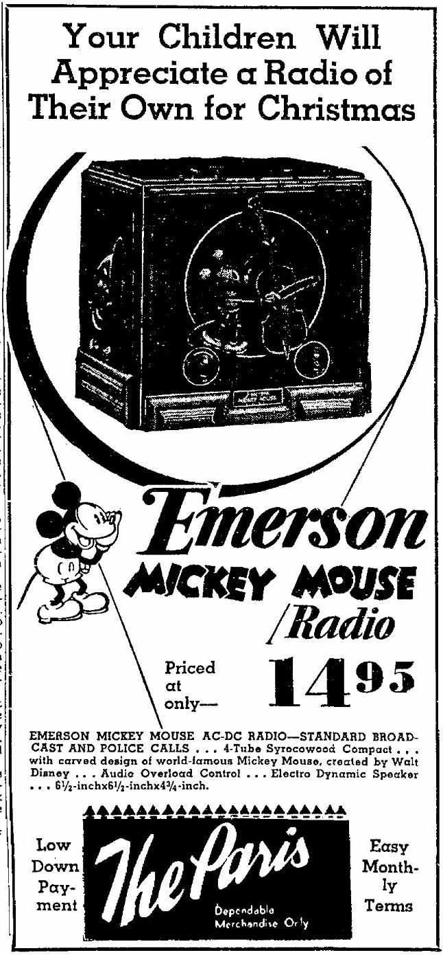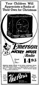 | Mickey Mouse and Other Novelty Sets Add New Dimension to Radio Market The world's most popular screen star has assumed a new role. Beloved by millions, he now breaks into radio. Walt Disney, his creator, has appointed the Emerson Radio and Phonograph Corporation as exclusive manufacturers and distributors of the Mickey Mouse receiving set. The advent of a radio line, housed in cabinets of lithesome design and gay colors, may mean more than that of their special appeal to little sister Betty or brother Bob at college or to dad for his den. While these sets should make easy the path for those dealers who go after the "second" and "third" radio sale per home, already there are signs that their cosmopolitan appearance is appealing to a wide variety of merchants. Toy shops, gift, jewellery and book stores see in these sets of novelty design an attractive item. That new and radical exterior designs, and new outlets, is assuming the proportions of a trend is further evidenced by the fact that Colonial is out with a set housed in a globe of the World - of direct interest to the businessman and proprietors of map and stationary stores. Then there is that attention getting two-tube "pocket" set by International - the Kadette Jr. People are buying them for "bridge" prizes, we are informed. Radio Retailing, October 1933. |