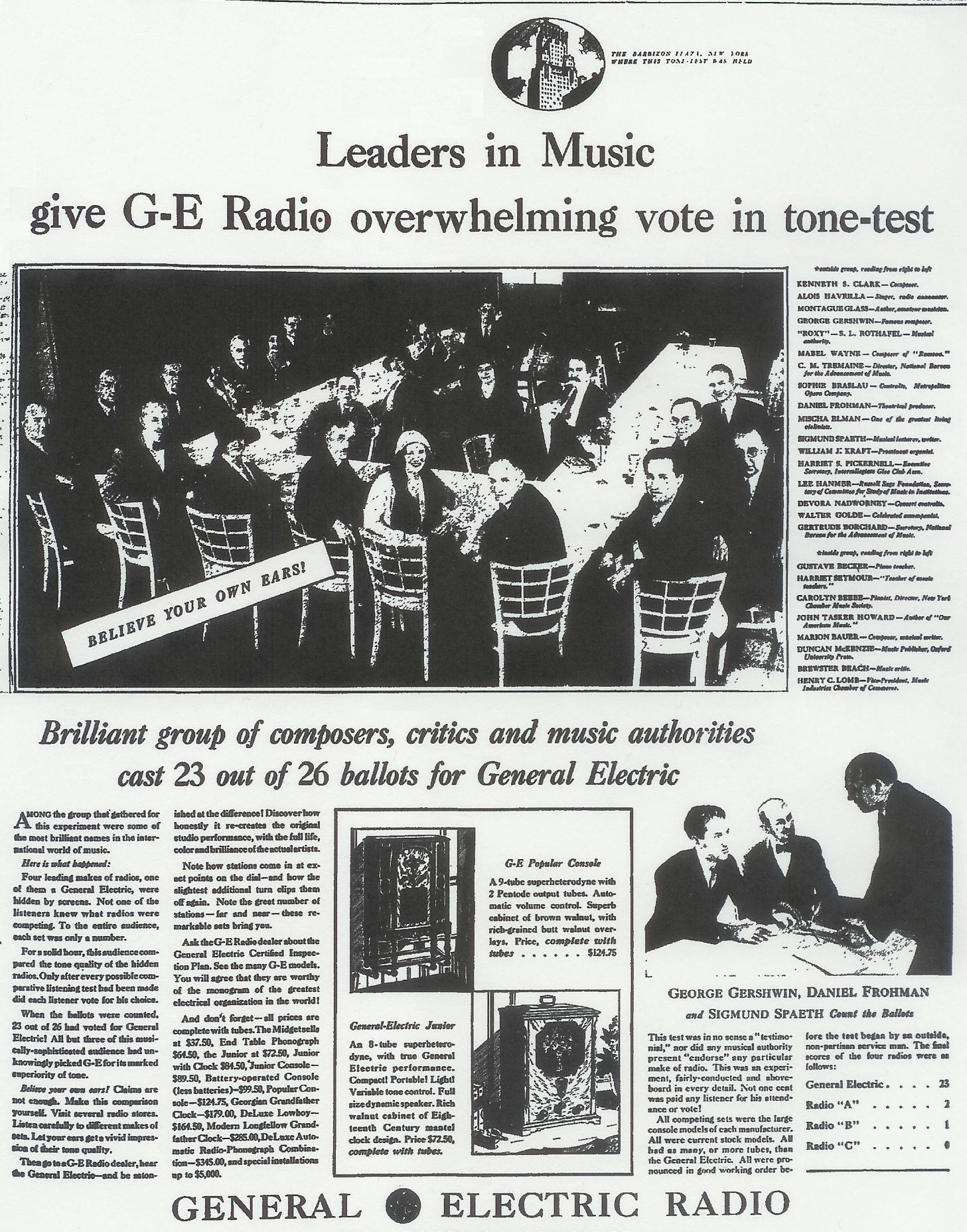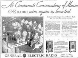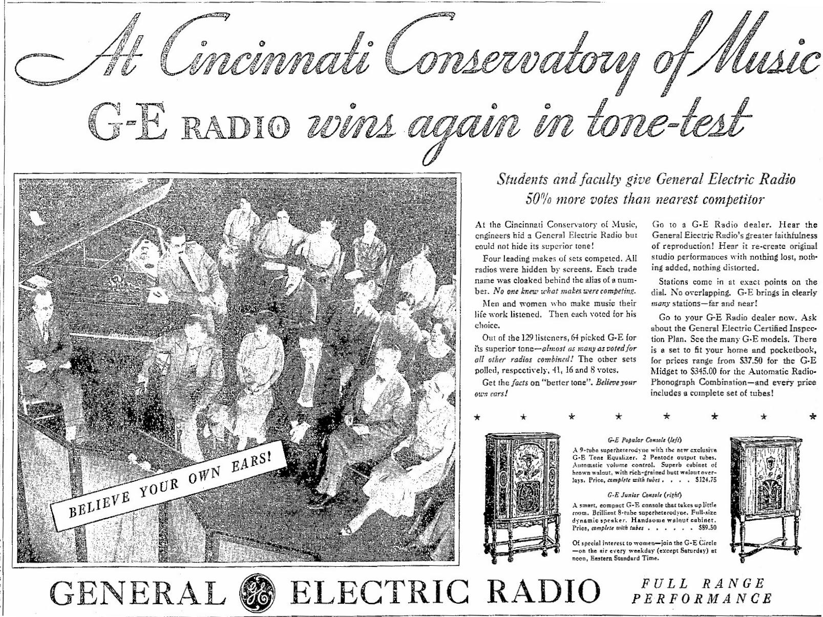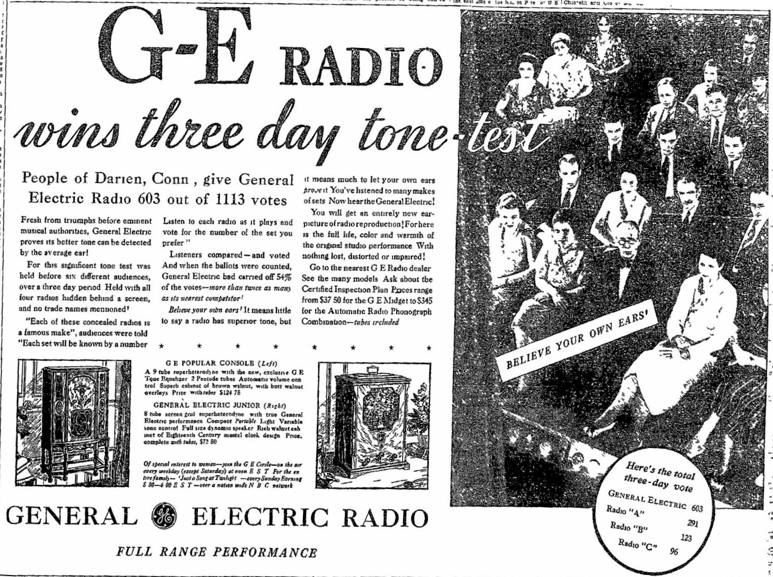 "Believe your own ears! Hear the General Electric before you spend a penny for radio. In the first minute you listen, you will understand why this great G-E instrument won every tone test, why it is the one radio for you. Here is glorious tone reality. It is like looking at a vivid autumn landscape, after viewing it in a black and white photograph!"