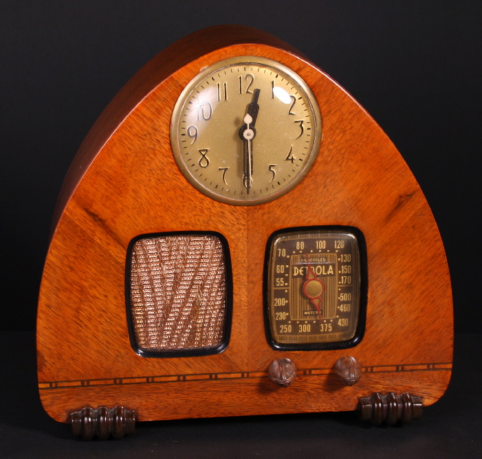 Detrola Radio Clock A dependable radio and an equally dependable, nationally-known self-starting synchronous clock combined in one unit...a grand gift for office or home. 5 Tubes Super-heterodyne receiver. No aerial no ground required. Automatic Volume Control.