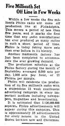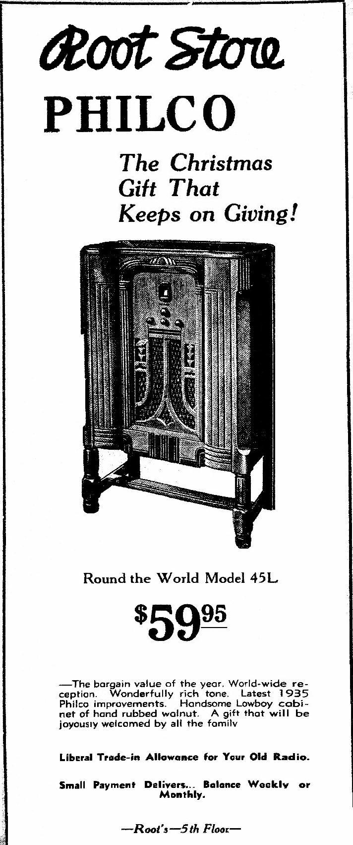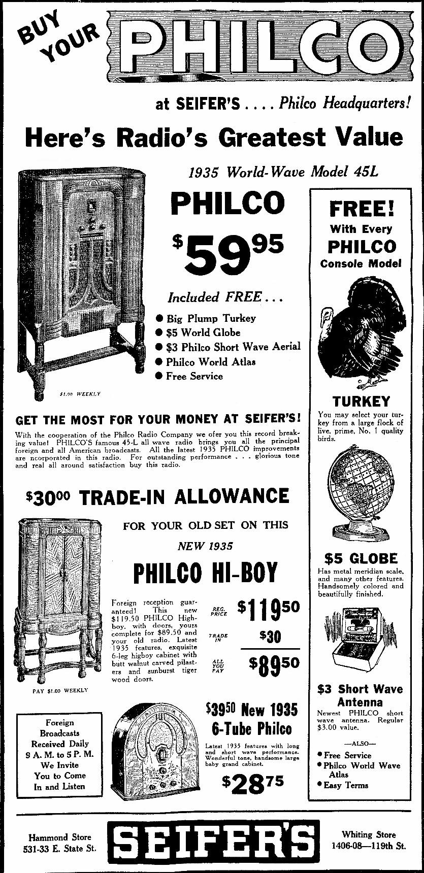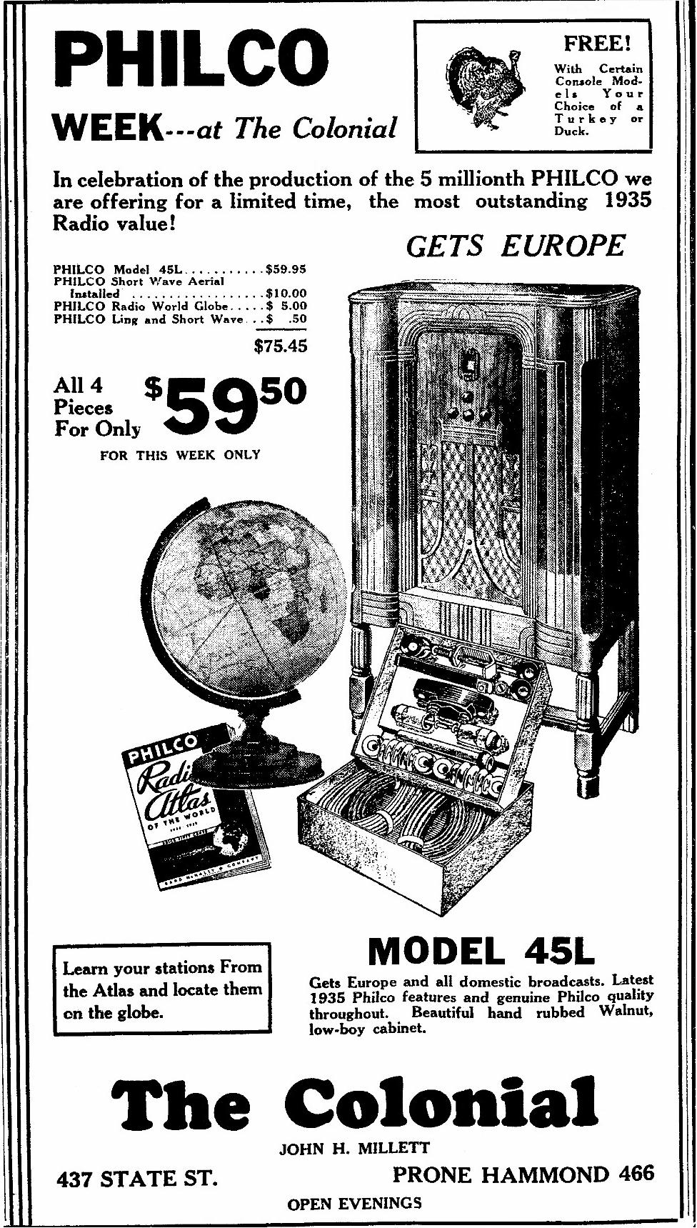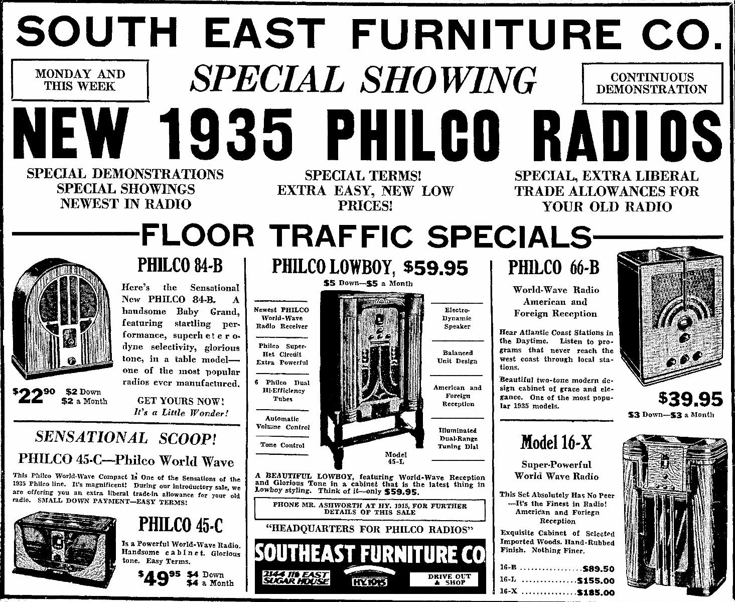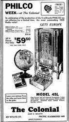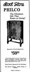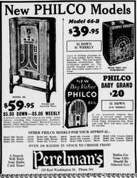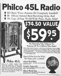 "A powerful new radio that tunes in the world. Latest features including Bass Compensation, Automatic Volume Control, Tone Control, Electro-Dynamic Speaker, PHILCO High Efficiency Tubes, Beautiful cabinet of choice woods."