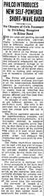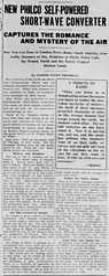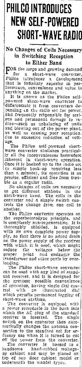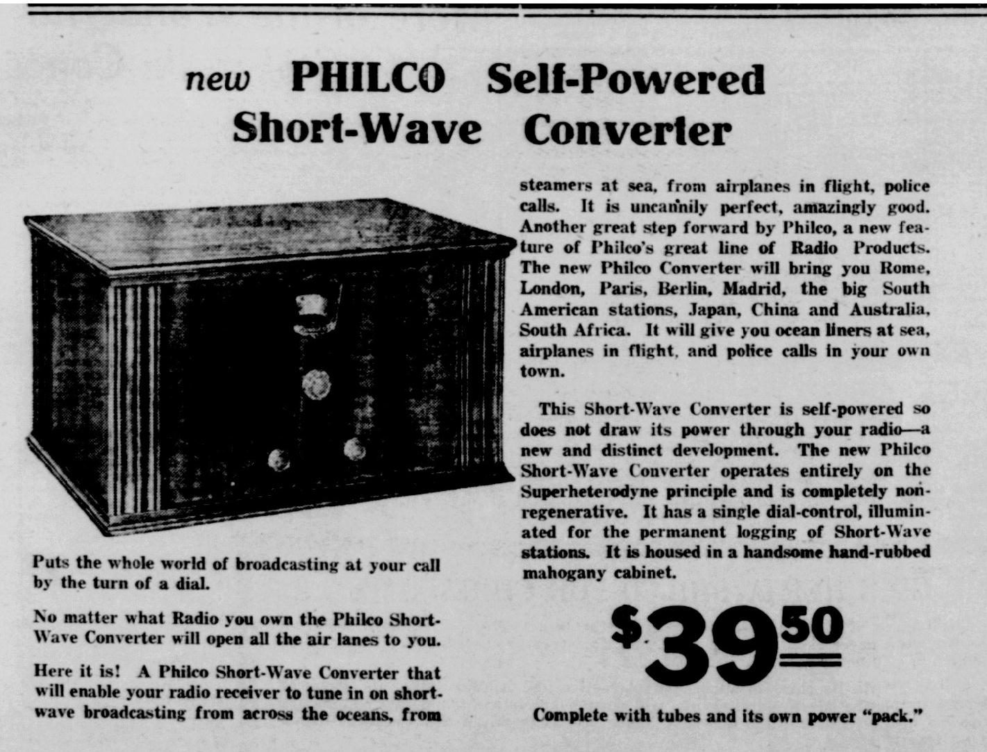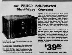 New! New! Philco Self-Powered Shortwave converter. This converter gives you all the world of radio: London, Paris, Berlin, Rome, South America, Asia, Australia, Ocean liners on the sea, air-liners a-wing. Police calls, every romance, mystery and thrill of the air. Self-powered, non-regenerative, can be used with ANY make of radio receiver. Complete with its own tubes and its own power pack.