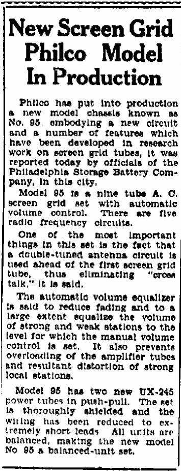 I came across the following 1929 newspaper article describing the features of the model 95's highboy cabinet.