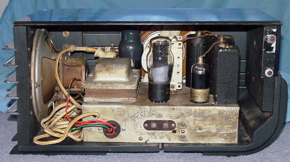 Readers familiar with the model 558 may notice that the end panel on my blue set is mounted upside down. I purchased this set from an Ebay seller, only to find its end panel cracked upon arrival. The seller, surprisingly, was able to furnish me with a replacement panel, but because it had a bevelled upper edge, it apparently was a replica. As a result, I had to install this panel with the engraved spears (see photo immediate right) pointing down instead of up, thereby concealing the bevel behind the retaining edge of the wooden cradle. Recently I was fortunate to acquire a genuine original panel and have since installed it as intended by the set's manufacturer - with the spears pointing up. I will post updated photos here as soon as I get the chance.