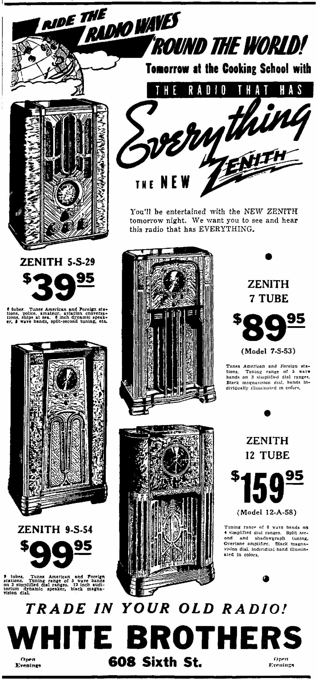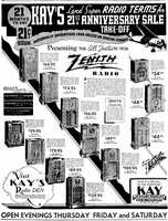 ZENITH Gives you every worthwhile feature! Black Magnavision Dial. Split second tuning. Wavebands in vari-colors. 5 wavebands on 3 simplified dial ranges. Metal glass tubes. |