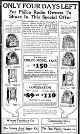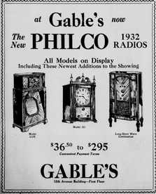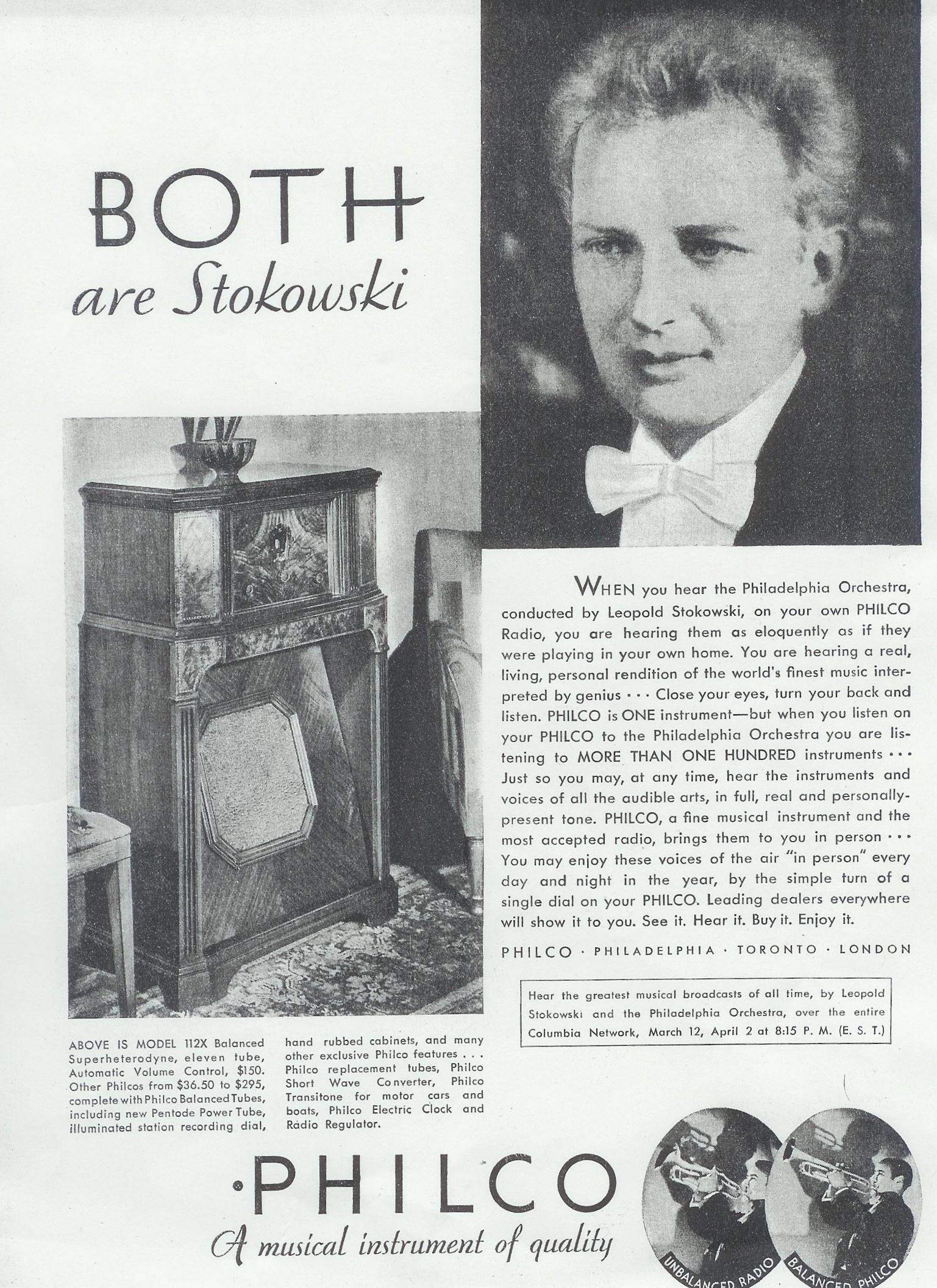 | The Philco model 112X was introduced in January of 1932, billed as the first radio scientifically designed as a musical instrument. It used an updated version of Philco's 11-tube superhetero- dyne plus chassis and was the company's first model to use the inclined sounding board, a new invention that was their latest salvo in the ongoing battle for superior tone. It looked radically different to any Philco that had preceded it and this prompt- ed the use of another catchy marketing phrase: It Looks Different. It Sounds Different. It IS Differ- ent! The importance of this innovation was such that, starting with the 112X, models using it would have an X appended to the model number. The 112X's cabinet was styled by Edward L. Combs (patent), who was also responsible for the design of the cabinets for the very successful models 70 and 90, introduced the previous June. The "inclined sounding board" was designed to provide clearer high frequency reproduction by dir- ecting high notes up towards the listener and away from the floor - keep the music off the floor they proclaimed. Furthermore, according to ads for the 112X, high frequencies emitted from the cabinet's rear were not only attenuated by Philco's new echo absorbing screen, mounted behind the speaker chamber, but were moreover directed down to the floor instead of being reflected back to the listener off of walls behind the radio. The innovation was used on various Philco models for a number of years and was obviously very successful, since ev- en though the 112X's rather unusual styling was short-lived, some later models achieved a more conventional appearance by inclining the speaker baffle internally behind a vertical front panel, while others lessened the angle of its incline, rendering it largely inconspicuous. The 16L is an example of a set that Philco referred to as having a concealed inclined sounding board, while the 116X is a set featuring an unconcealed board with reduced ang- le of inclination. In any event, much was made of the feature by Philco in the design and marketing of their sets throughout the 1930s. Of the 112X, in a 1932 advertisement Philco commented Words cannot express the supreme quality of this mar- velous instrument. Here is a fidelity of tone bey- ond anything you ever thought possible. Turn your back or close your eyes, you will believe that you are in the actual presence of the art- ists themselves. The original purchase price of the 112X was $150, complete with Philco tubes (East, $155 out West). The 112X uses the highly sensitive 11-tube bal- anced superheterodyne plus chassis with push- pull type 47 pentode output stage, tuned RF amp, 2 IF stages, AVC, Philco's much-touted 4-point tone control and illuminated station-recording dial. Selectivity is great thanks to a 4-gang tuning cond- ensor, with dual antenna tuning in the front end, and two IF stages. The complete tube line-up is 24 (RF), 27 (oscillator), 24 (mixer), 24 (1st IF), 24 (2nd IF), 27 (2nd detector), 27 (detector amp)*, 27 (1st AF amp), 47 * 2 (push-pull output) and 80 (rectifier). It covers standard broadcast from 550 to 1500kcs. Probably one of the best sounding models of the season for its price. The schematic may be found at NostalgiaAir. During 1931 model 112 had been available in a very different cabinet, sans the inclined sounding board, designed by Norman Bel Geddes. Initially, for serial numbers below 174001, that model employed push-pull 245 triodes in its output stage rather than type 47 pentodes. Philco changed over mid-production to use the more modern, higher- output 47 types but according to some commentat- ors this resulted in degraded sound quality. The pentodes were known to produce higher levels of distortion than the sweet-sounding 45s, which to this day have remained a staunch favorite of audio- philes. Never before so much distortion from a bottle was one remark made about the type 47 pentode shortly after its introduction. This radio had been sitting in an antiques store for a while before I finally made up my mind to buy it. It had been fully restored and plays beautifully. * For a description of the Philco "multiplex detector" see the foot of my Philco 111 page. |