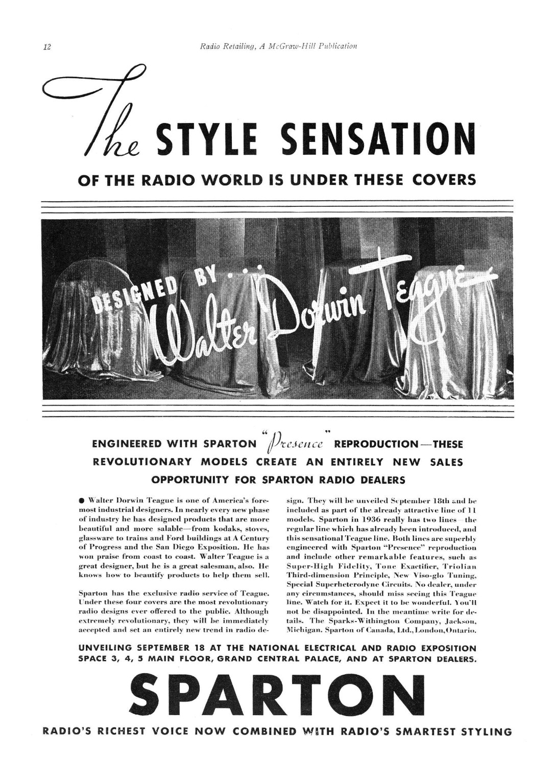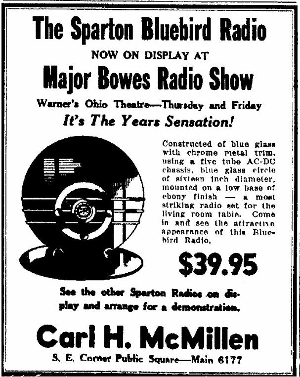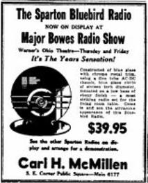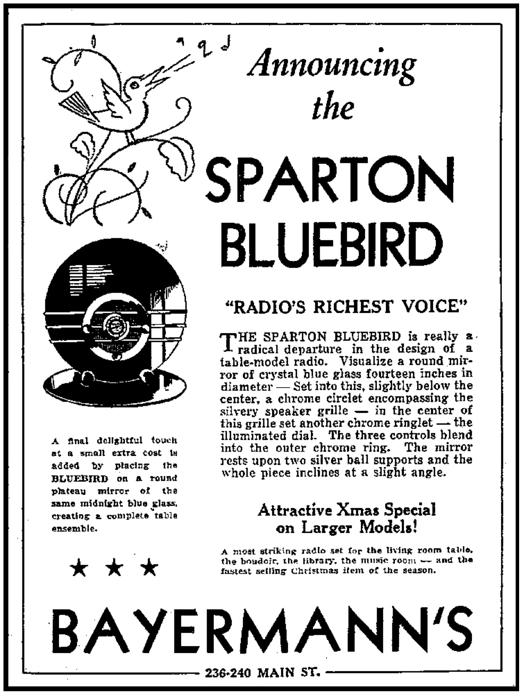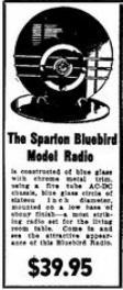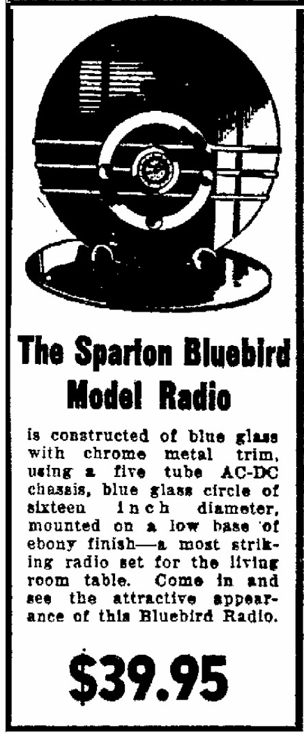 | "SO OUT OF the ordinary, so daringly distinctive was Sparton's midnight blue Nocturne that the desire to own was immediate. Size and price, in many cases, however outweighed immediate action on that desire. Believing from this, that a radio receiver much smaller in size but incorporating the glass and metal motif created for us by Walter Dorwin Teague would quickly awaken this desire Sparton now proudly announces Bluebird Model 566. Created with the same artistry as the larger model and employing the same unusual combination of crystal, chrome and metal while not an actual reproduction in miniature its appointments harmonize so well that its appeal is instantaneous. Sparton's Bluebird emphasizes a fourteen-inch circle of deepest midnight blue mirror glass. Set into this slightly below center is a chrome circlet the border for a silvery speaker grille which is the field for a second chrome circle that holds an illuminated dial. Three controls blend perfectly into the outer chrome ring. The ensemble rests at a slight tilting angle upon two ebony balls. Although strikingly beautiful by itself its smartness is accentuated when it rests on a fourteen-inch round midnight blue plateau mirror, which must be ordered separately" |